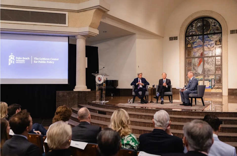 To kick off its 2026 speaker series, the LeMieux Center for Public Policy at Palm Beach Atlantic University hosted former U.S. Secretaries of State John Kerry and Mike Pompeo. The bipartisan policy discussion, moderated by Gunster Chairman George S. LeMieux, centered around topics like the international conflicts with China, Russia, Latin America, and Iran—the latter ultimately escalating just two days after the discussion. Over 300 gathered to hear the former secretaries' thoughtful and civil discourse on issues facing Florida, the nation, and the globe.